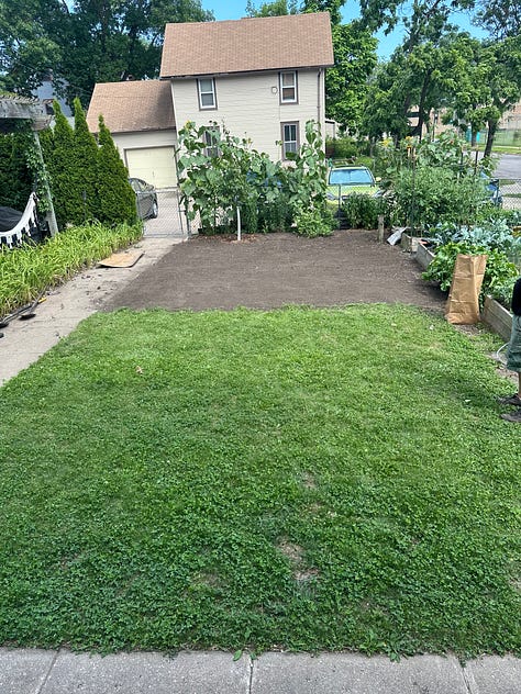 Last weekend, we removed the last of the garden beds and put in a bee lawn. There were also rain garden and concrete-moving projects going on at the same time. It was hot and humid and the work was physically demanding. Manual labor in the heat will make just about anyone crabby and we all had our moments of impatience and frustration to work through. It’s harder to see the beauty in those moments but it is there too.